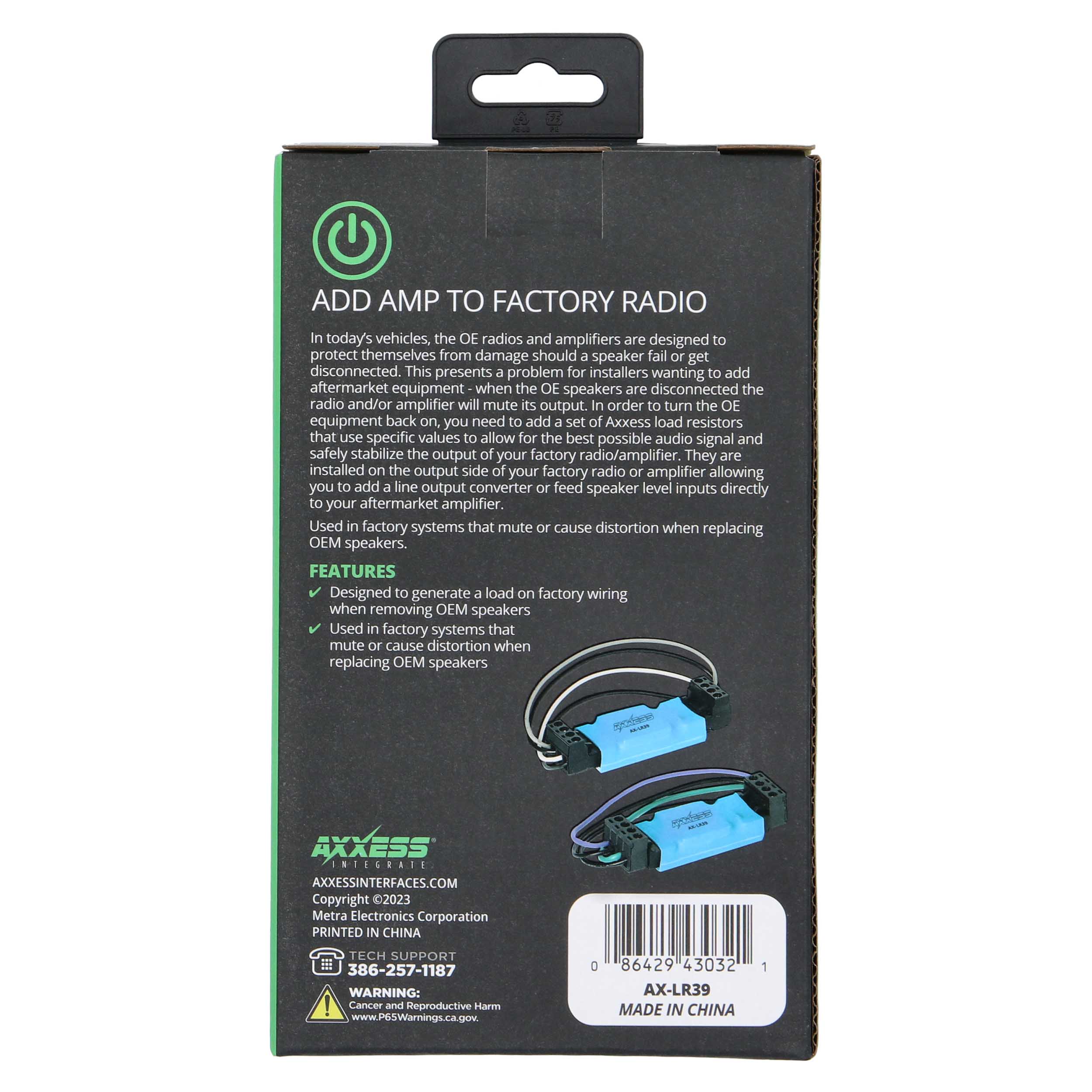 This load resistor will solve common problems for installers adding aftermarket equipment while providing the best possible audio signal. Factory audio systems in modern vehicles are designed to mute the output of the radio and/or amplifier should a speaker fail or get disconnected. Axxess load resistors prevent this so that installers can add aftermarket equipment. These products use specific values to allow for the best possible audio signal and safely stabilize the output of a factory audio system. They are installed on the output side of your factory radio or amplifier, allowing you to add a line output converter (LOC) or feed speaker-level inputs directly to your aftermarket amplifier.