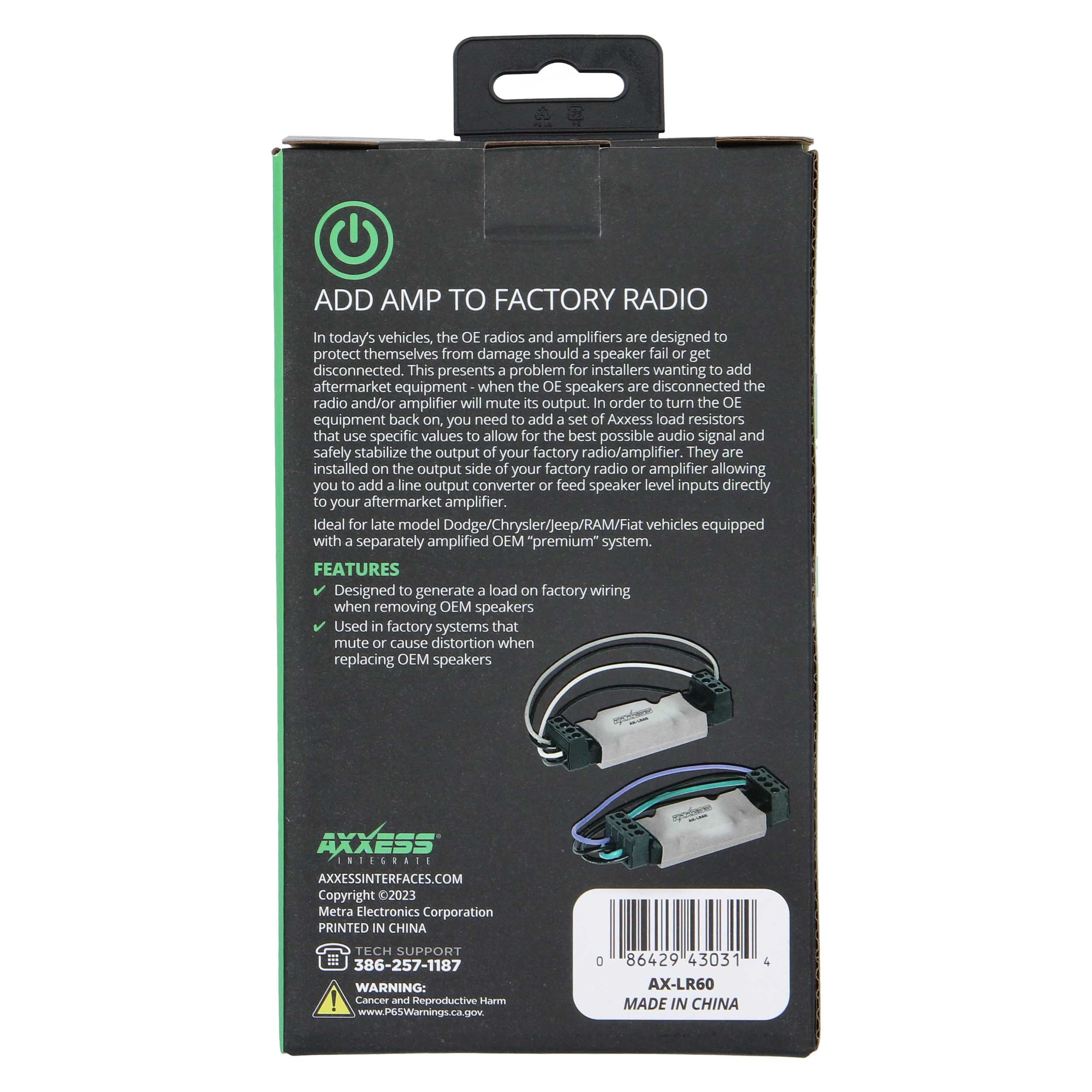 This load resistor will solve common problems for installers adding aftermarket equipment while providing the best possible audio signal. Factory audio systems in modern vehicles are designed to mute the output of the radio and/or amplifier should a speaker fail or get disconnected. Axxess load resistors prevent this so that installers can add aftermarket equipment. These products use specific values to allow for the best possible audio signal and safely stabilize the output of a factory audio system. They are installed on the output side of your factory radio or amplifier, allowing you to add a line output converter (LOC) or feed speaker-level inputs directly to your aftermarket amplifier.
