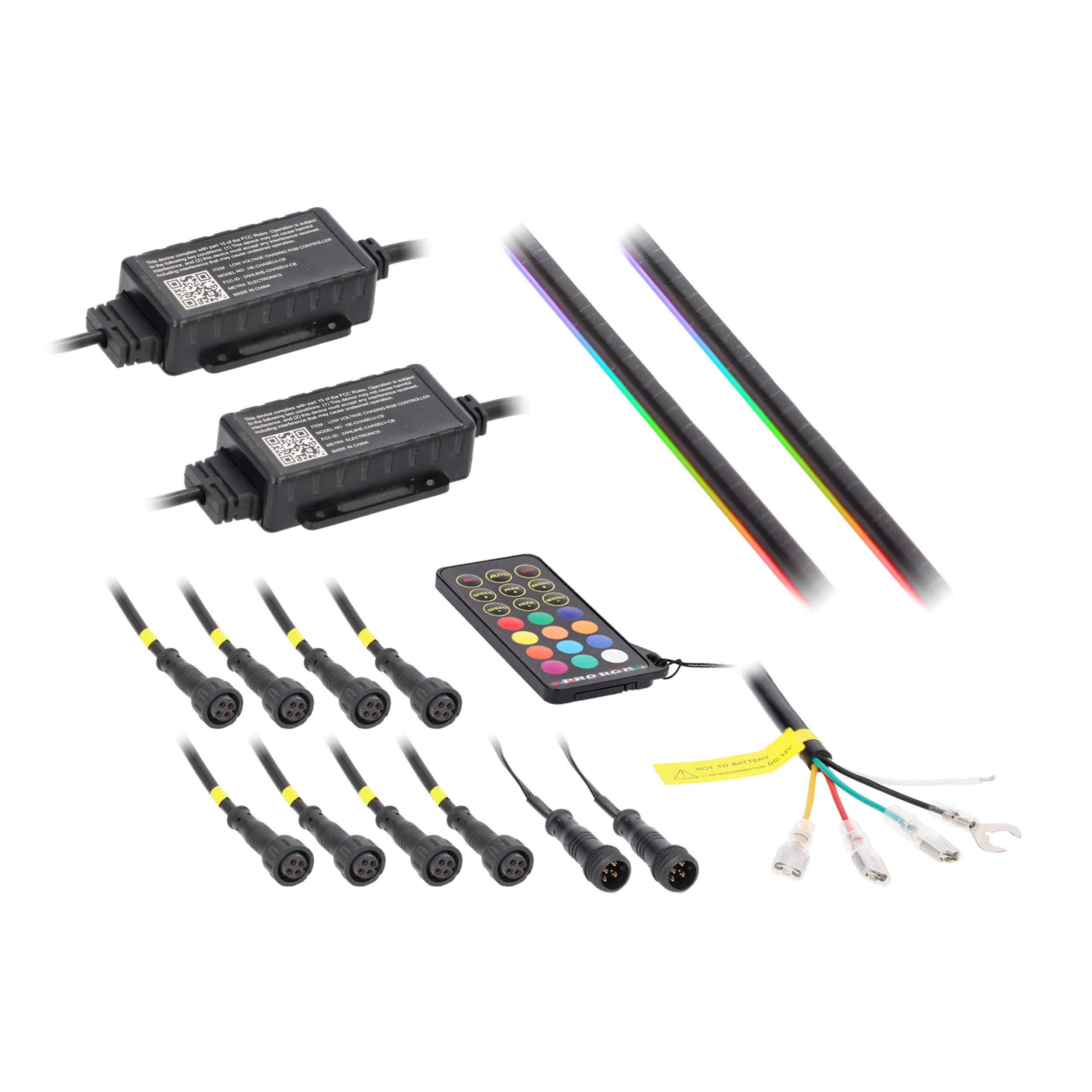 Quickly and easily add brilliant ambient lighting along the interior contours of any vehicle’s doors with this two-door kit. This kit includes two chasing LED mini strips, two chasing Heise Connect controllers, and two RF remotes and is designed to add lighting accents to door panels reminiscent of modern luxury vehicles. A controller is included for each door for simplified installation. Each light strip has an ultra-dense LED configuration that creates fluid motion and is controlled via the free downloadable Heise Connect mobile app for smart devices.