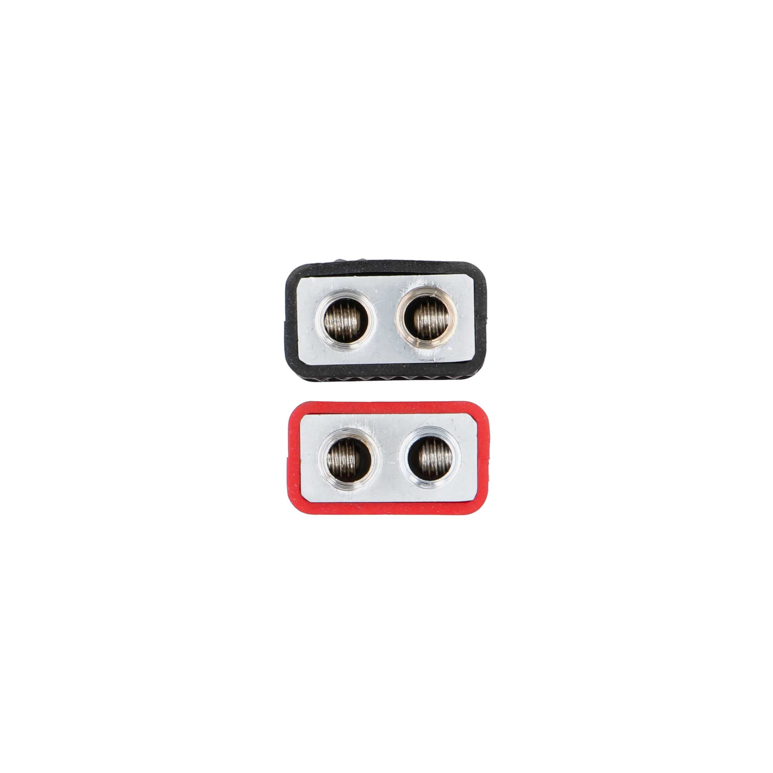 This pair of input wire reducers is a convenient solution for aftermarket audio upgrades in any vehicle. They each accept an input of dual 8GA wire and output for a single 8GA wire that will fit into an amplifier's terminal. They provide a secure connection featuring hex screws and easy installation with no crimping required.