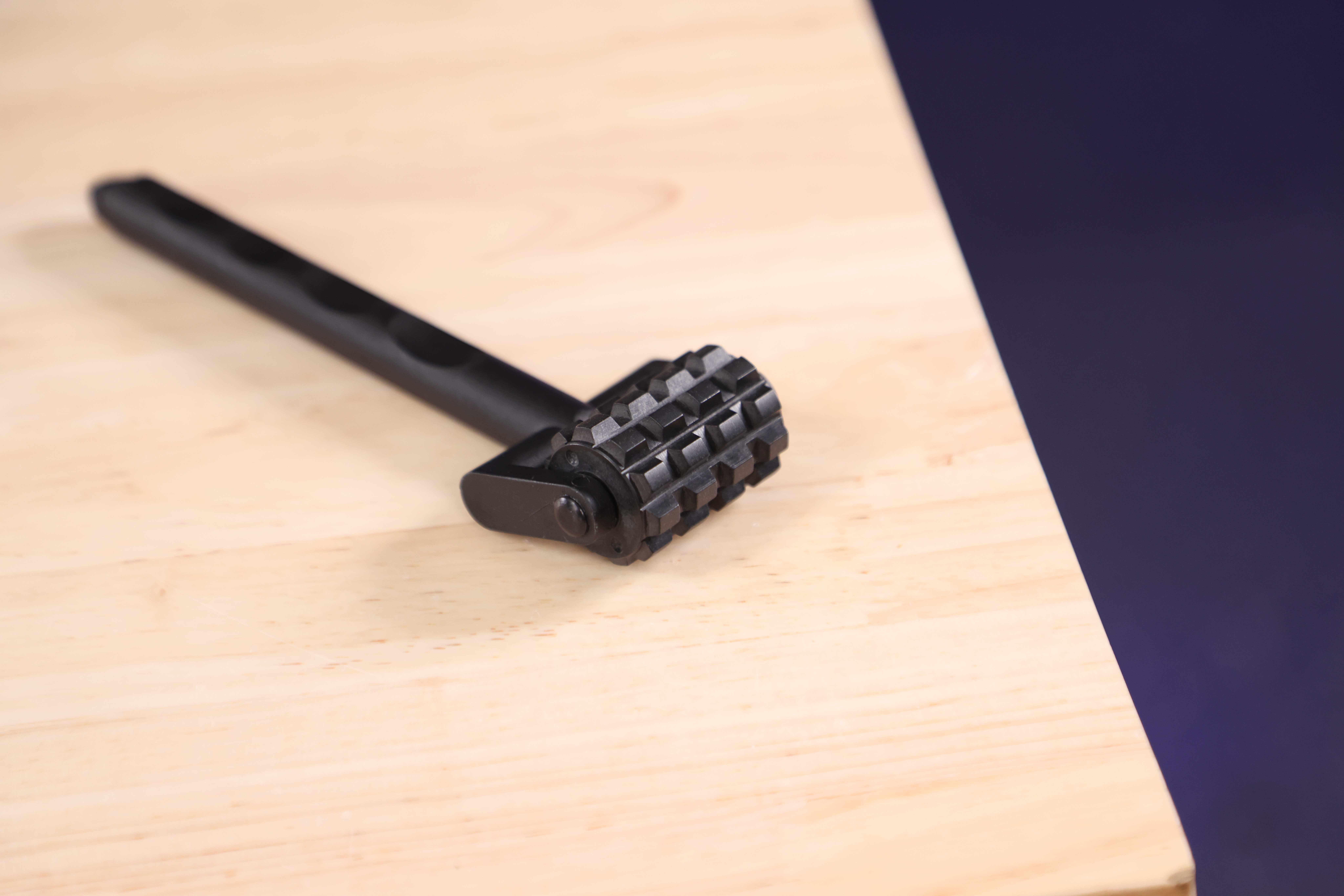 The Ballistic Grid Roller is 1.5" wide and made of a corrugated rotating wheel, angled at 160°, which helps to better operate and prevent the drum from slipping. Its ergonomic handle engineered with finger grips is comfortable to use. It has a tethering eyelet for attaching a hanging loop to keep bench clutter to a minimum.
