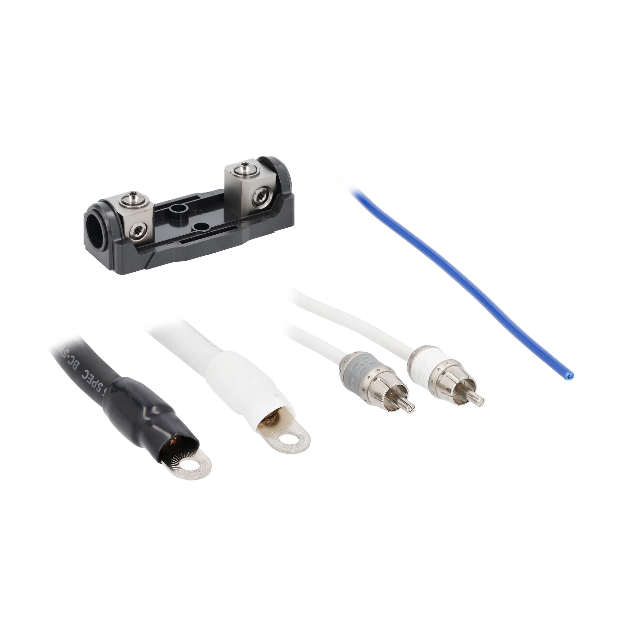 • 1/0 AWG spade terminals with silver and black boots for amp connection