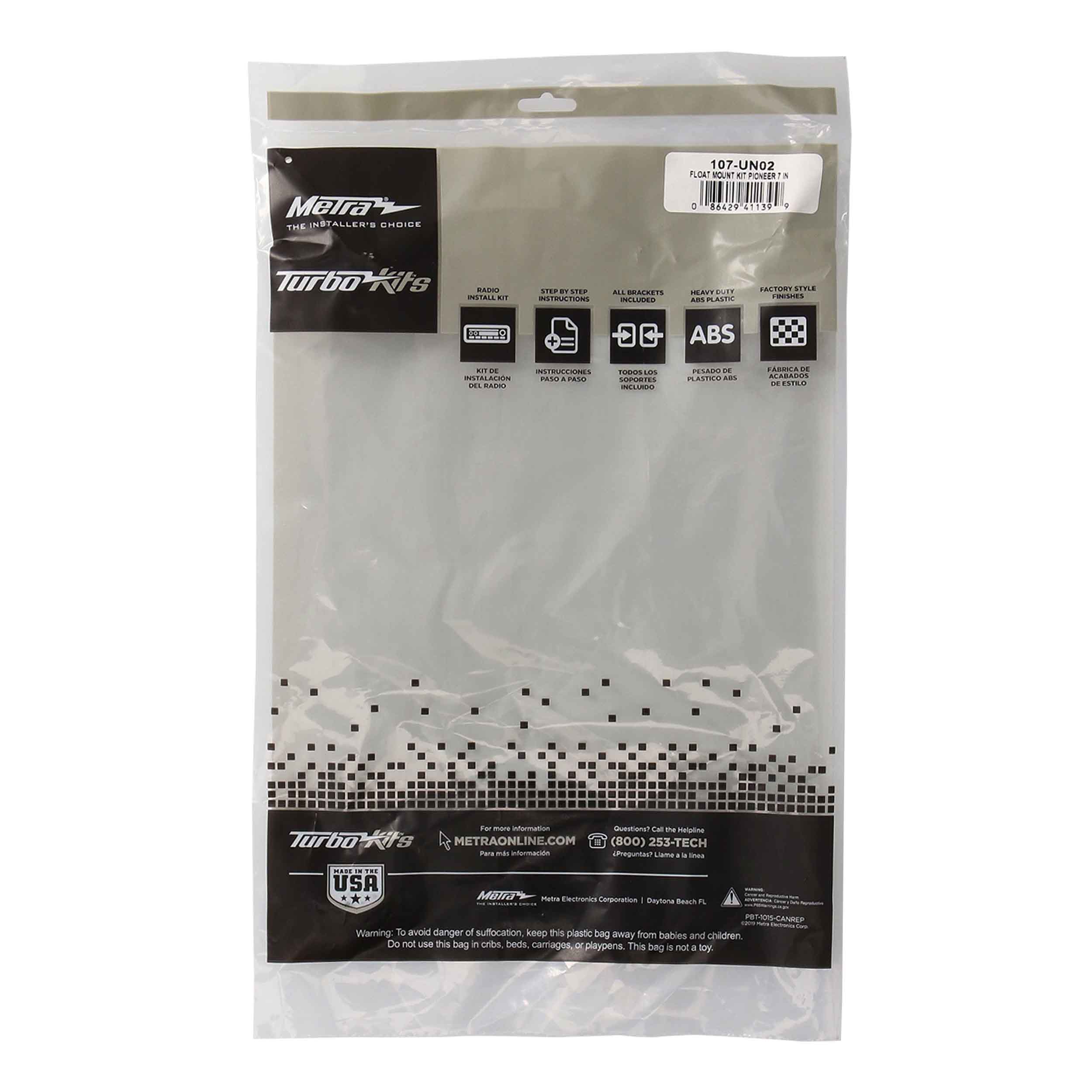 The 107-UN02 is a universal mount designed to “float” the Pioneer 6.8-inch screen in front of a vehicle’s original radio location using a series of brackets that provide the ability to easily mount the radio’s chassis into the radio/pocket location of more than 250 existing Metra Double-DIN kits for 1990 to current vehicle applications.