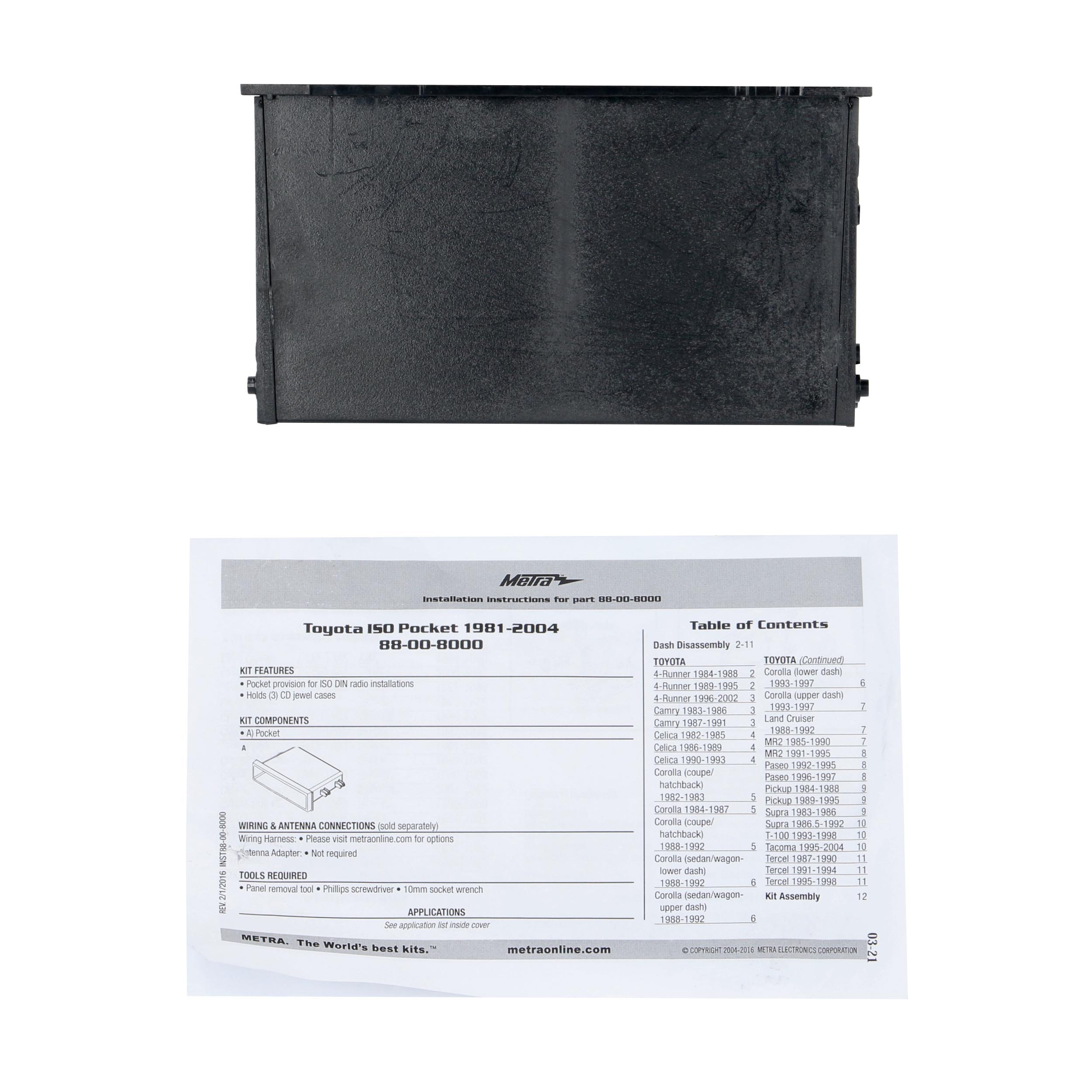 This dash pocket has been designed to be used when replacing a factory 4” tall (Double-DIN) radio with a 2” tall (Single-DIN) aftermarket radio into the original vehicle dashboard. The pocket makes radio replacement simple by filling the extra space in the radio opening, which can be used for storage. Installing an aftermarket radio can upgrade the sound quality and provide additional features the original factory radio couldn’t offer but requires this pocket to make it fit when installing a Single-DIN radio.