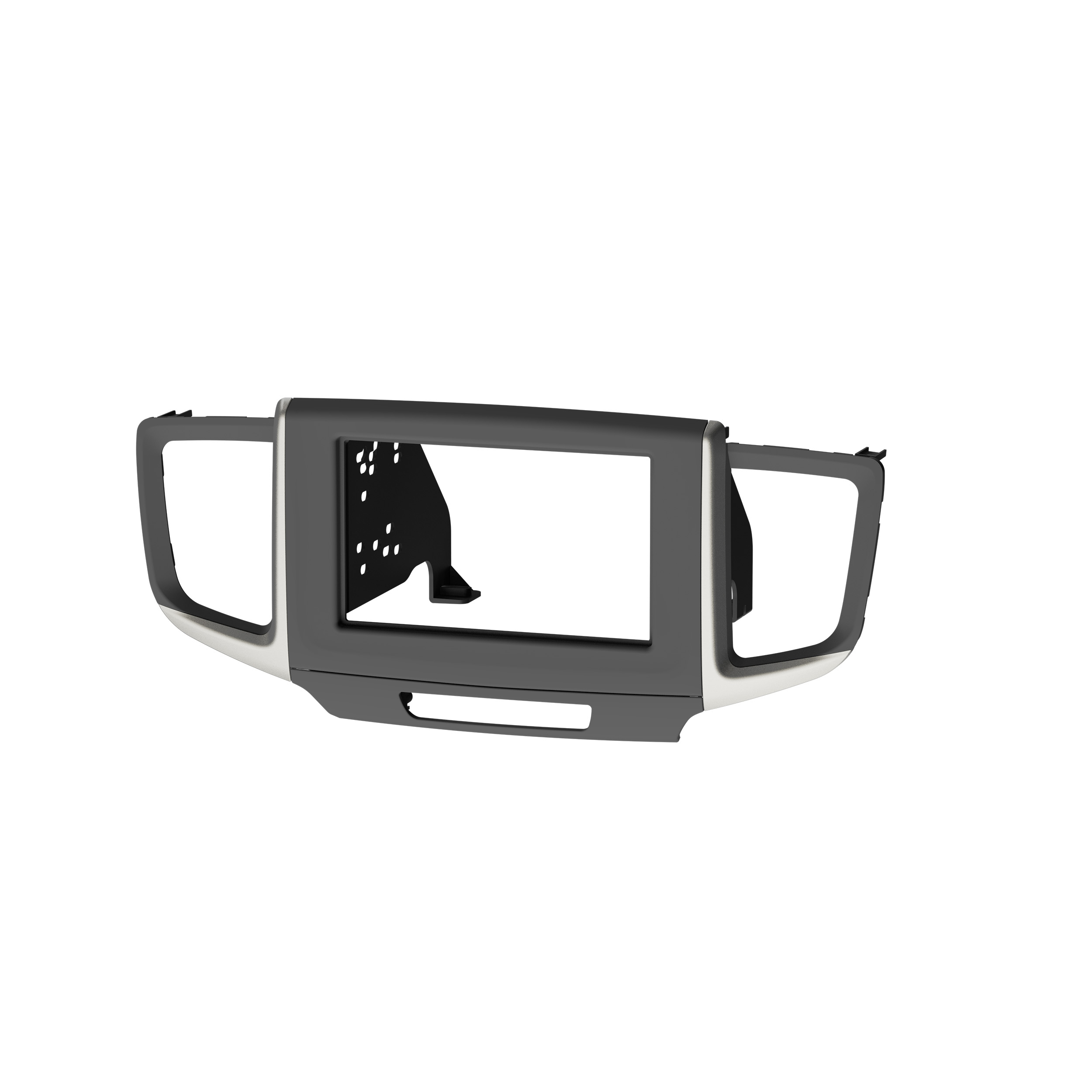 This stereo installation kit is engineered to help you install an aftermarket 4" tall (Double-DIN) radio into the original vehicle dashboard. This dash kit helps make radio replacement simple and is painted scratch-resistant matte black with silver trim around vents to match the original look and feel of the vehicle's dashboard. Installing an aftermarket radio can upgrade the sound quality and provide additional features the original factory radio couldn't offer but requires this dash kit to make it fit.
