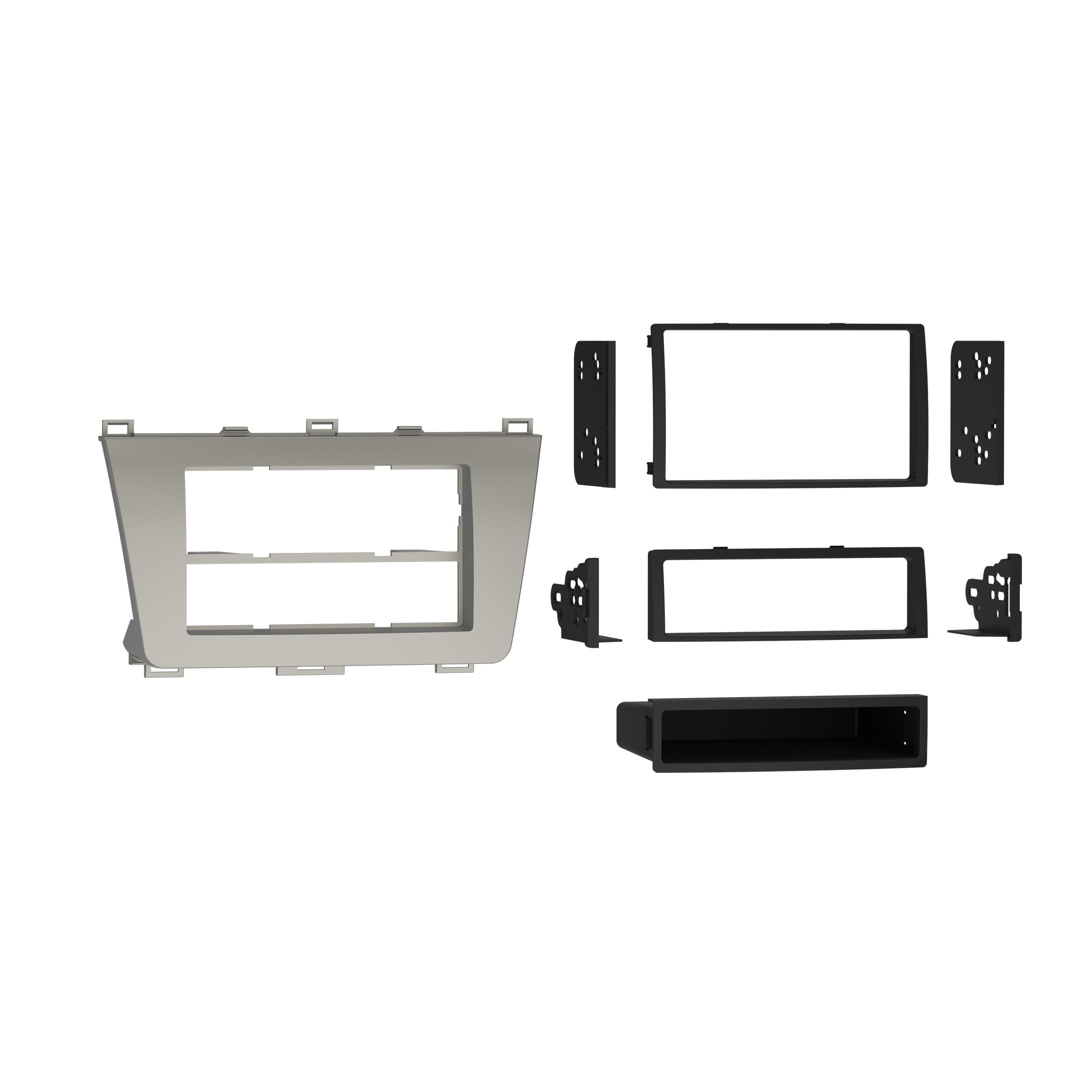 This stereo installation kit has been engineered to help you install either a 2” tall (Single-DIN) or a 4” tall (Double-DIN) aftermarket radio into the original vehicle dashboard. This dash kit makes radio replacement simple and comes with a pocket that is installed below the 2” radio to fill the extra space in the radio opening, which can be used for storage. The pocket is not needed when installing a 4” tall radio. The dash kit is contoured, textured, and painted silver to match the original look and feel of the vehicle’s dashboard. Installing an aftermarket radio can upgrade the sound quality and provide additional features the original factory radio couldn’t offer but requires this dash kit to make it fit.