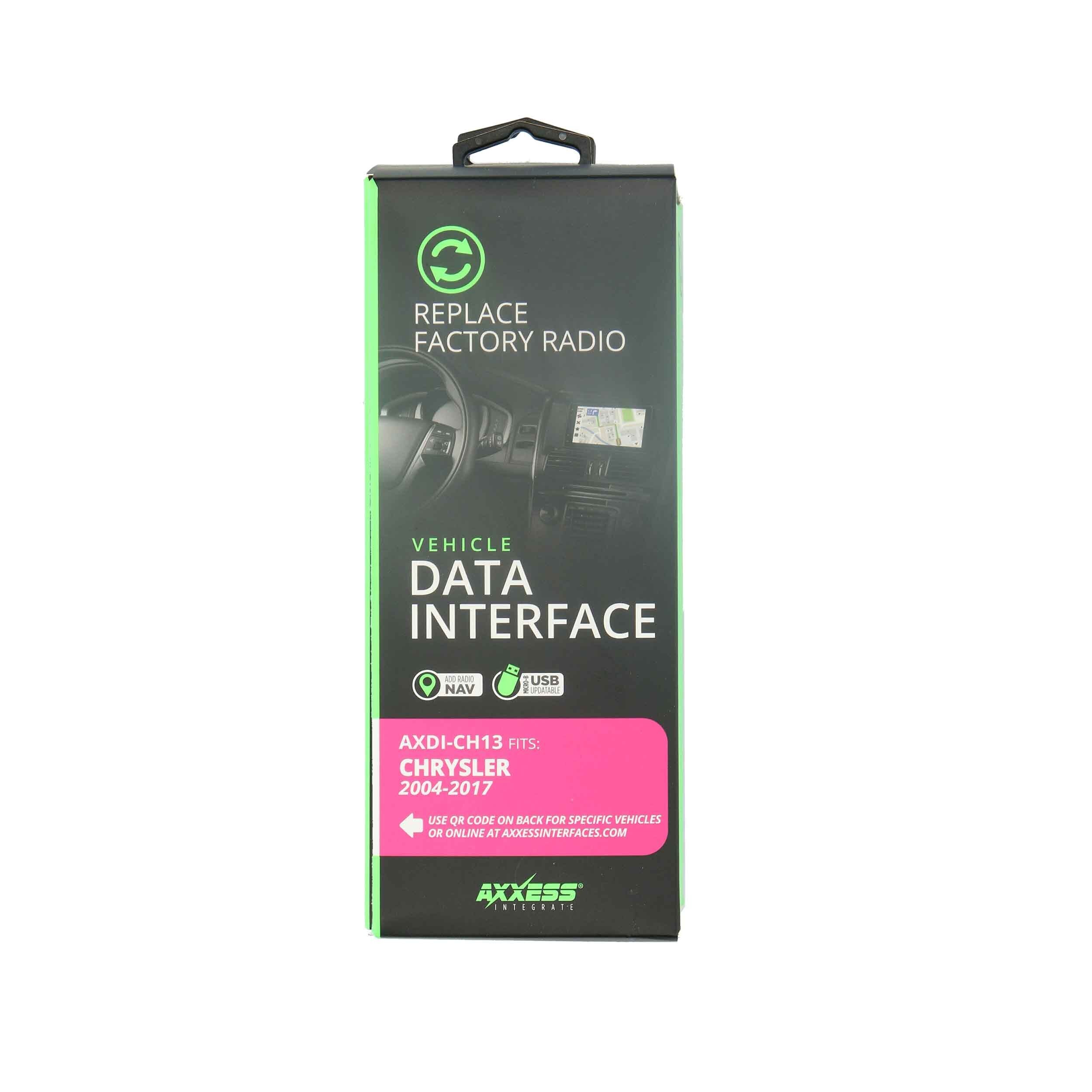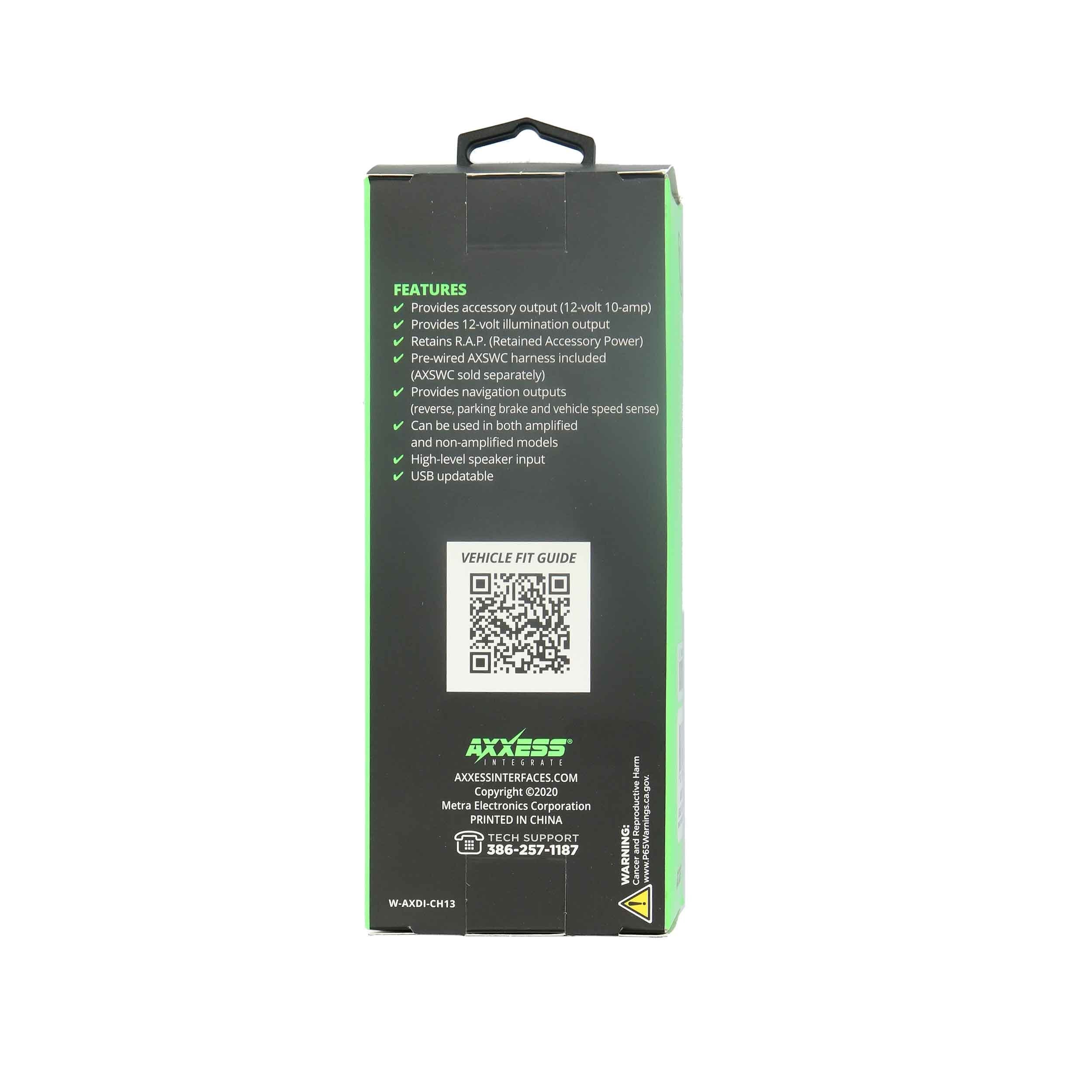 The AXDI data interface allows installing an aftermarket radio while retaining select factory features that are typically lost during installation. It provides Retained Accessory Power (R.A.P.), 12-volt 10-amp accessory power, and NAV outputs for parking brake, reverse, and speed sense. In supported vehicles, it can also retain features such as factory chimes and blind spot detection.