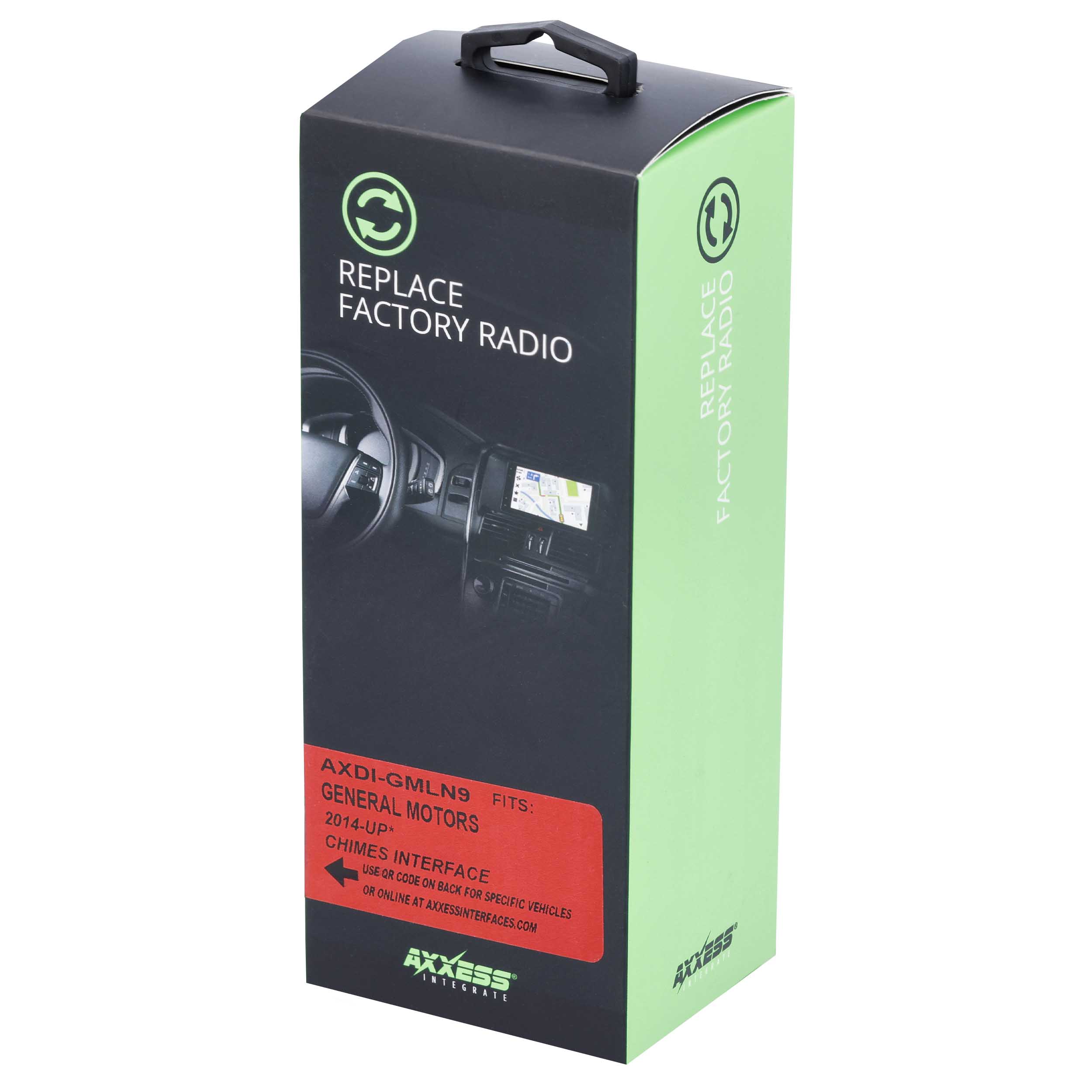 The AXDI data interface allows installing an aftermarket radio while retaining select factory features that are typically lost during installation. It provides Retained Accessory Power (R.A.P.), 12-volt 10-amp accessory power, and NAV outputs for parking brake, reverse, and speed sense. In supported vehicles, it can also retain features such as factory chimes and blind spot detection.