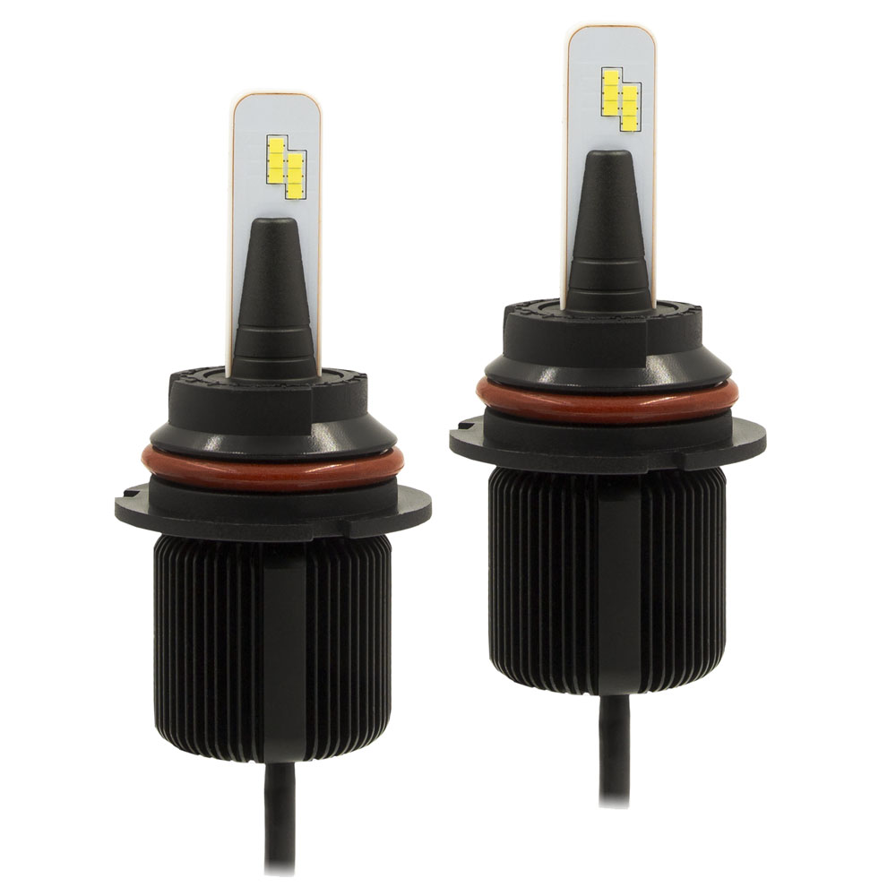 These bright lights are designed to fit into tight spaces with a compact design that does not compromise performance. By engineering a high density fin design, these bulbs stay as cool or even cooler than traditional LED bulbs with bulky heat sinks or messy braid designs. The light output is equally impressive with a total of 6,000 lumens of cool white (6500K) illumination per pair using 20 watts per bulb. Kits are available in the most common headlight sizes.