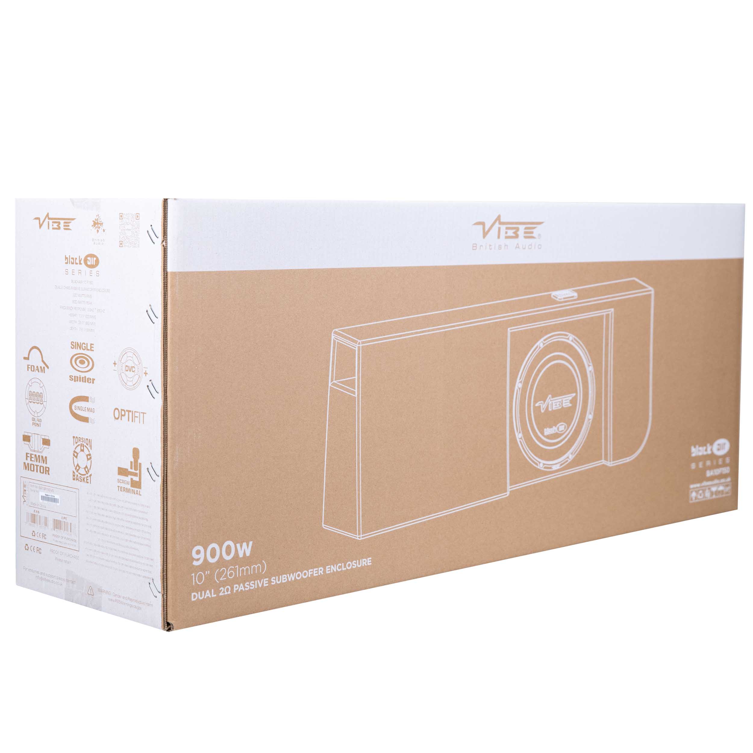 The enclosure comes preloaded with a VIBE Audio Blackair 10-inch shallow-mount subwoofer featuring a purpose-built motor assembly capable of handling up to 300 watts RMS and 900 watts peak power. Dual 2-ohm voice coils provide flexible wiring options and are easily configured at the enclosure’s terminal connector.