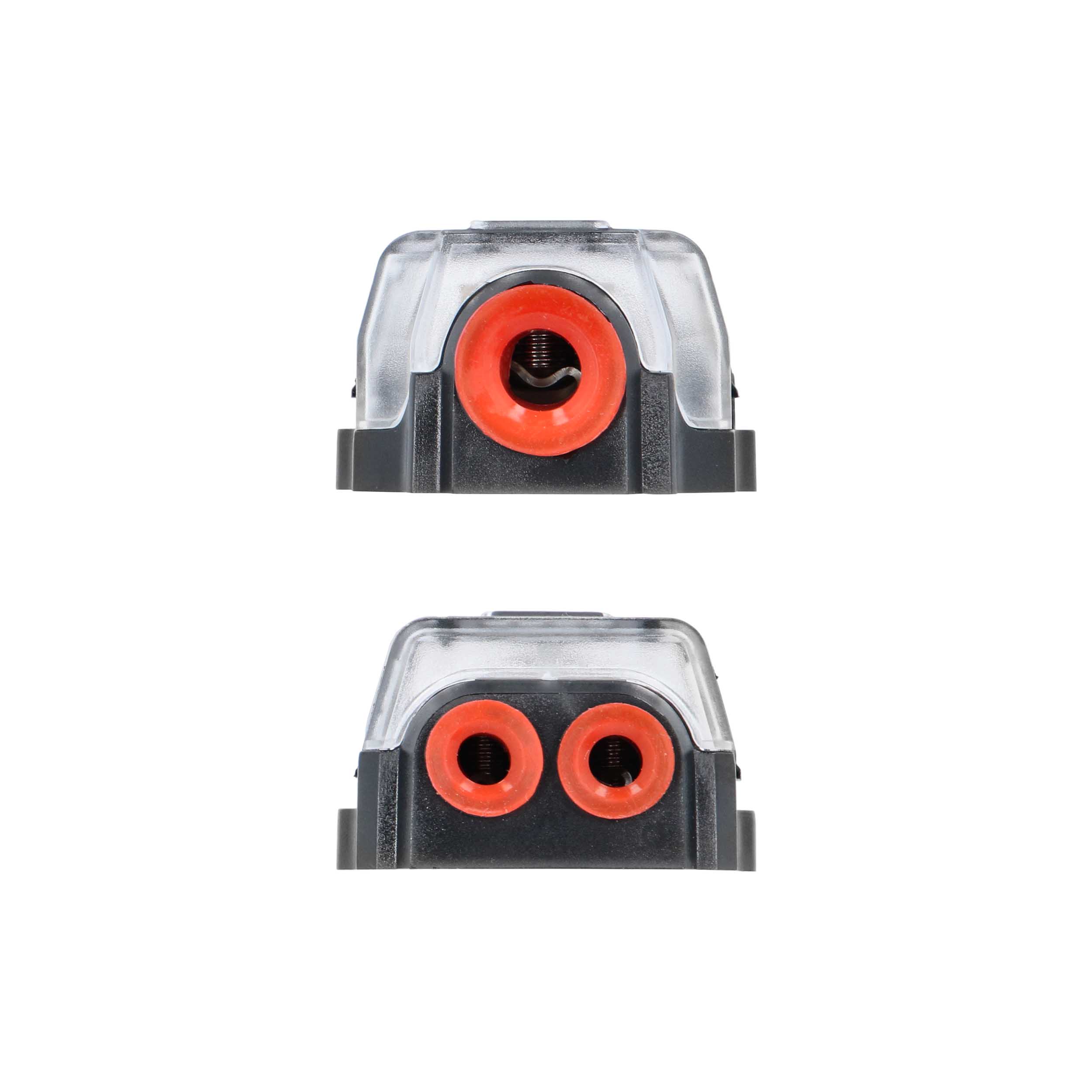 The T-Spec VDB2 Ground Distribution Block provides a secure and efficient solution for splitting ground connections in high-performance mobile audio systems. Designed for flexibility, it accepts 1/0 to 4 AWG input and distributes to two 4- or 8-AWG outputs, making it ideal for multi-amplifier installations.